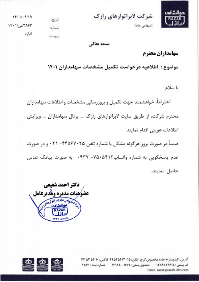 تکمیل مشخصات سهامداران رازک از طریق پرتال