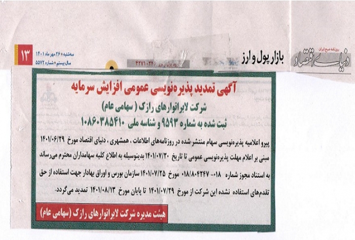 اعلامیه پذیره نویسی سهام شرکت لابراتوارهای رازک (سهامی عام)