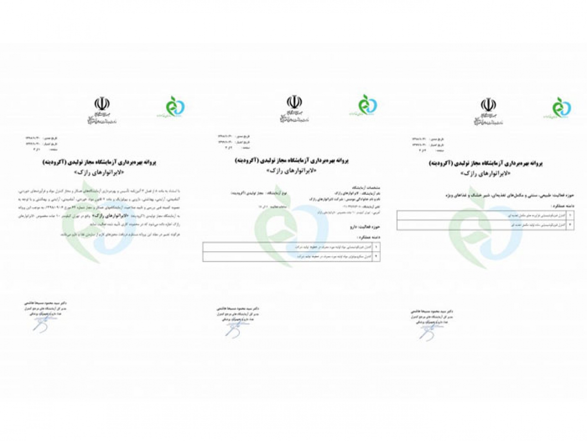 بدینوسیله مفتخریم اعلام نماییم آزمایشگاه کنترل شرکت لابراتورهای رازک موفق به تمدید پروانه بهره برداری آزمایشگاه مجاز تولیدی ( آکرودیته ) به مدت یکسال گردید . به موجب این پروانه تمامی مواد اولیه شیمیایی ، مواد اولیه گیاهی ، مواد اولیه مکمل تغذیه ای و محصولات مکمل تغذیه ای می توانند از نظر فیزیکی ، شیمیایی و میکروبی در این آزمایشگاه مورد آزمایشگاه قرار گیرند و در صورت مناسب بودن نتایج آزمایشات با مسئولیت مدیر آزمایشگاه کنترل بعنوان نماینده و همکار آزمایشگاه مرجع غذا و د ارو مورد مصرف و فروش قرار گیرند.