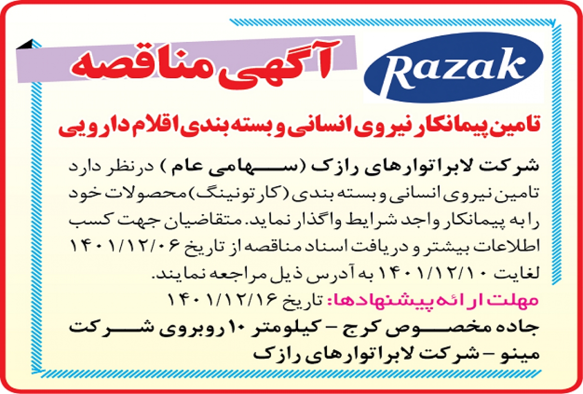 تامین پیمانکار نیروی انسانی و بسته بندی اقلام دارویی - RazakPharma.com